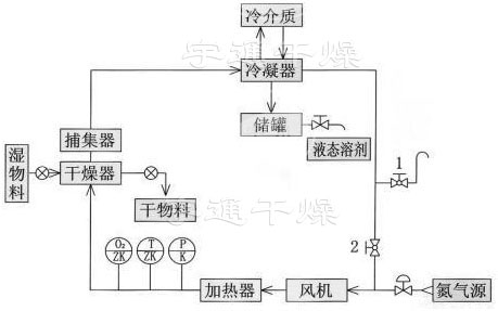 閉路循環沸騰干燥機是一個閉環系統。開始時,啟動風機,打開閥門1,關閉閥門2,輸入惰性氣體(一般為氮氣),將系統內原有的空氣置換,當系統內氧氣含量達到預定指標后,關閉閥門1,打開閥門2.。從此,系統內氮氣作為傳熱、傳質的介質,完成濕物料的干燥目的。濕物料內所含有機溶媒氣化后,與氮氣一同進入冷凝器,將溶媒冷凝成液體流入儲罐,氮氣由于沸點較低不可能液化,在風機推動下進入下一輪循環。閉路循環沸騰干燥機系統中的干燥裝置可以根據物料狀態和要求選用圓筒式沸騰干燥機(又叫沸騰),也可以是箱式沸騰干燥機,也可以是震動流化床干燥機,甚至氣流干燥機,由于這些干燥機都是流態化干燥,因此干燥速率較高,物料的干燥時間短。