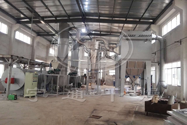 在干燥主機的上部設置環形擋板,此被稱為閃蒸干燥機分級器。當物料運動經過該分級器時變會受到離心力的作用,呈現不同旋轉半徑螺旋上升的趨勢。粒徑較小的物料從分級器的內孔排出;顆粒較大的物料被留在干燥室內繼續粉碎,待達到標準粒度從內孔排出。