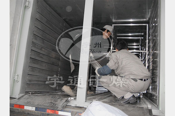 物料經裝盤后,連盤帶車進入隧道烘箱的進口處,由傳動機構將其帶入隧道內, 烘車運行速度可調;冷風從新風補充口進入離心風機,經翅片式換熱器加熱后, 送入隧道箱內與濕物料充分接觸,進行熱量交換,物料內的水分被蒸發為水蒸汽 ,與熱空氣一道進入箱體側面的風道內,一部分濕空氣由排濕口排空,另一部分 由離心風機吸入后,循環使用;由于每個單元的物料的含濕量不同,每個單元的 排濕量與循環風量的比例也各不相同;在整個干燥過程中,熱風溫度也均不相同 ;干燥初期的物料含水率較高,可選用較高的熱風溫度;干燥后期的物料含水率 較低,可選用較低的熱風溫度。