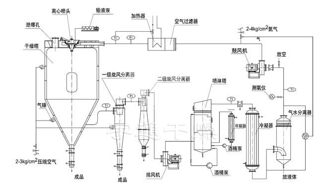 閉路循環(huán)噴霧干燥機,是有機溶劑類料漿干燥的專用設(shè)備。該機組是由氮氣(或其他惰性氣體)作為干燥循環(huán)氣體,干燥過程物料可以防止氧化、同時有機溶劑可以回收。閉式循環(huán)噴霧干燥機一般用于乙醇、丙酮、己烷等有機溶劑類制備料漿的粉體干燥,設(shè)備采用設(shè)計,干燥過程安全。