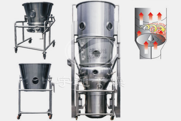 流化床分風板做成特殊環形片式結構,各片形成層疊形式,讓氣流從葉片的間隙通過,形成環流狀的高速氣流,從而使物料呈旋渦狀似的規則運動,通過安裝在側壁的氣動噴嘴將粘合劑或包衣液噴入規則流物料層,從而將粉體制成顆粒或得到連續均勻的膜衣。