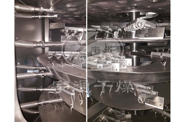 濕物料連續加入耐壓加料斗,通過上部真空球閥將物料輪流分配進入料罐后,料罐上下部真空球閥輪換打開、關閉,物料在攪拌電機作用下連續地加到干燥器上部層干燥盤上,帶有耙葉的耙臂做回轉運動使耙葉連續的翻抄物料,使物料充分吸收熱量,物料沿指數螺旋線流過干燥盤表面,在小干燥盤上的物料被移送到外緣,并在外緣落到下方的大干燥盤的外緣,在大干燥盤上的物料向里移動并從中間落料口落入下層小干燥盤中,大小干燥盤上下交替排列,物料得以連續的流過整個干燥器,中空的干燥盤內通入加熱介質。加熱介質由干燥盤的一端進入干燥盤面,從另一端導出。已干燥的物料從底層干燥盤落到殼體的帶冷卻底層,然后被耙葉移送到出料口排出底部料罐,并經上下真空球閥輪換開關出料。濕份從物料中蒸發汽化后逸出,由真空泵強制抽出,溶劑經冷凝器冷凝進入緩沖罐回收,整個操作過程在負壓下進行,濕份后排空。