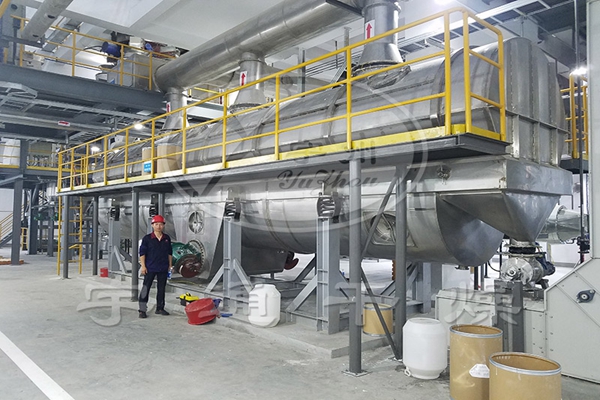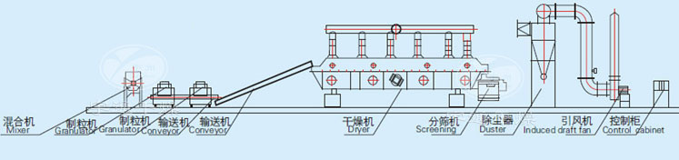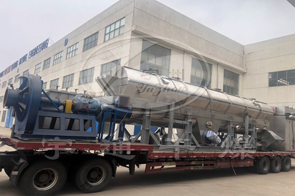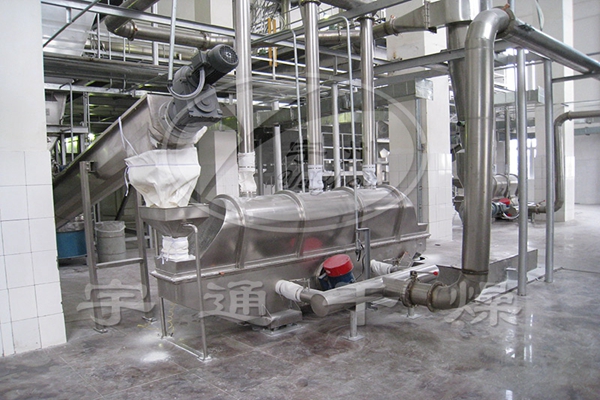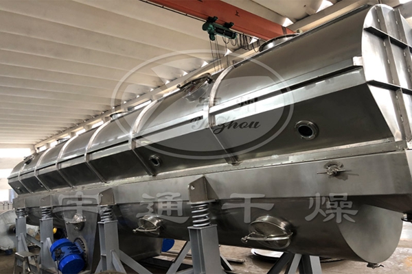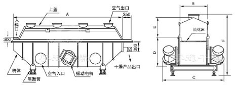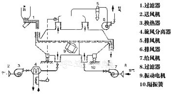 物料自進料進口進入機內,在振動力作用下,物料沿水平面流化床拋擲,向前連續(xù)運動,熱風向上穿過流化床同濕物料換熱后,濕空氣經(jīng)旋風分離器除塵后由排風1:3排出.干燥物料由排料進口排出。
