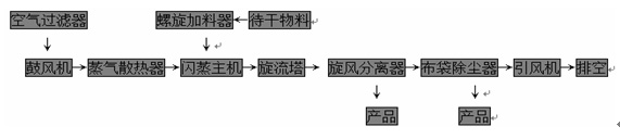 經(jīng)過初、中效過濾的環(huán)境空氣由干燥系統(tǒng)引風(fēng)機(jī)吸入熱風(fēng)空氣,與蒸汽換熱后產(chǎn)生的熱風(fēng)進(jìn)入閃蒸干燥主機(jī),與經(jīng)過螺旋加料器送入干燥主機(jī)的待干燥濾餅,在干燥主機(jī)內(nèi)完成傳熱傳質(zhì)的干燥過程,氣固混合物由旋風(fēng)分離器和布袋除塵器分離,物料被從干燥系統(tǒng)氣體內(nèi)分離出來,排出干燥系統(tǒng),尾氣由引風(fēng)機(jī)排入大氣。