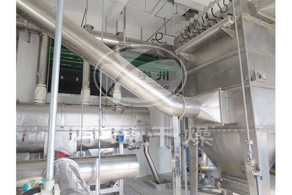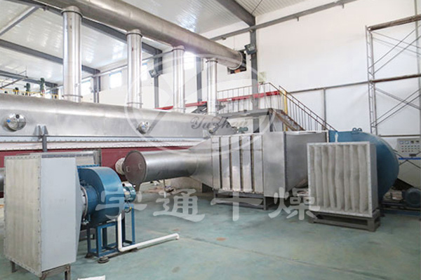 3、由于施加振動,可使小流化氣速降低,因而可顯著降低空氣需求量,進而降低粉塵層夾帶,配套熱源,風機,旋風分離器等也可相應縮小規格,成套設備降低,效果明顯。可方便地依靠調整振動參數來改變在機內滯留時間。其活塞流式的運行降低了物料粒度均勻性及規則性要求,易于獲得均勻的干燥產品