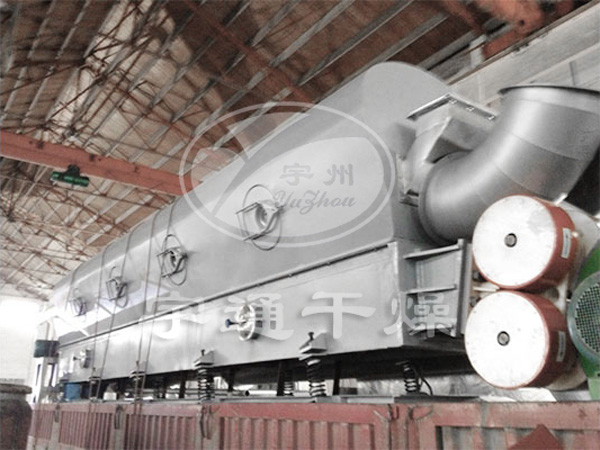 物料自進料口進入機內,在振動電機或其他方式提供的激振力作用下,在空氣分布板上跳躍前進,同時空氣經(jīng)過濾后,被加熱到一定溫度,由風口進入干燥機下風室中,物料在振動力和經(jīng)空氣分布板均風的熱氣流雙重作用下,呈懸浮狀態(tài)與熱氣流接觸,物料顆粒與熱介質之間進行著激烈的湍動,使傳熱和傳質過程得以強化,干燥后的產(chǎn)品由排料口排出,蒸發(fā)出的水份和廢氣經(jīng)旋風分離器回收粉塵后,排入大氣。下床體為床層提供了一個穩(wěn)定的具有一定壓力的風室。調節(jié)引風機,使上箱體中床層物料上部保持微負壓,維持良好干燥環(huán)境并防止粉塵外泄。