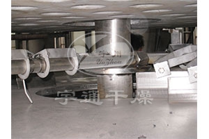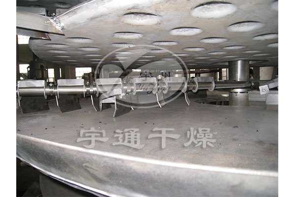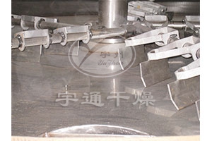 密閉型盤式連續干燥機是在常壓型盤式連續干燥機的基礎上進行密閉處理,從而更適合于需要回收溶劑、物料易氧化、物料異味較重的場合,它具有:連續運行、密閉操作、蒸發強度大、濕度梯度分布合理、動力消耗低、占地面積小、等優點。同時,其配置簡單,不使用熱風作為加熱介質,因此,不會發生因熱風和粉塵分離不好隨尾氣夾帶造成的產品損失。盤式連續干燥機由干燥盤、耙臂、裝在耙臂上的若干耙葉、碾磙、主軸、傳動裝置、外殼等組成,中空的干燥盤內通入加熱介質。物料在干燥盤面上由耙葉輸送、翻動、呈阿基米德螺線軌跡運動,在運動過程中被干燥盤加熱,進行傳熱傳質完成干燥作業,根據被干燥物料的產量、性質、初始及終含濕份量,確定干燥盤層數(干燥面積)。盤式連續干燥機立式工作,濕物料由頂部的加料口加入,通過每層干燥盤后由干燥機的底部排出,從物料中釋放出的濕氣由經除塵后由引風機排入大氣。