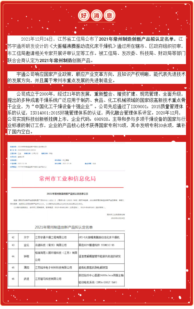 2021年12月17日,江蘇省工信廳公布了2021年度省“專精特新小巨人”擬定企業名單和復核擬通過企業名單。宇通干燥經企業申報、市縣審核推薦、形式審查、專家評審等程序成功入圍。