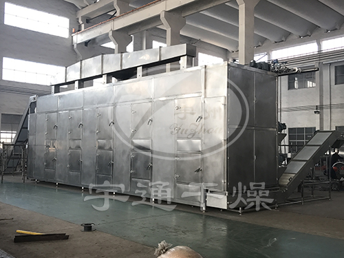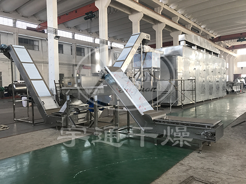 DW多層帶式干燥機屬廂式結構,廂內(nèi)設有多層傳送帶,傳送帶在廂內(nèi)循環(huán)運動。物料均勻分布在層傳送帶上,通過網(wǎng)帶輸送,由層網(wǎng)帶倒入下一層網(wǎng)帶,下層反向交替逐一直落到后一層網(wǎng)帶,此時物料水份也達到烘干要求。空氣循環(huán)采用逆流工藝,高溫低濕空氣從干燥機下層網(wǎng)帶向上穿流,進行傳質(zhì)傳熱,從而達到去除水份的目的,尾氣通過引風機由頂部排出。設備自動化程度高,物料在干燥過程自動翻料,保證物料干燥均勻。勞動強度低,工作環(huán)境好,設備維護簡單。箱底設計有落料斜板及快開清掃門,便于清理箱內(nèi)粉料。