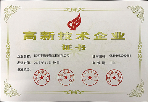 近日,江蘇宇通干燥工程有限公司再獲“高新技術(shù)企業(yè)”資質(zhì),有效期為2016年11月至2019年11月。